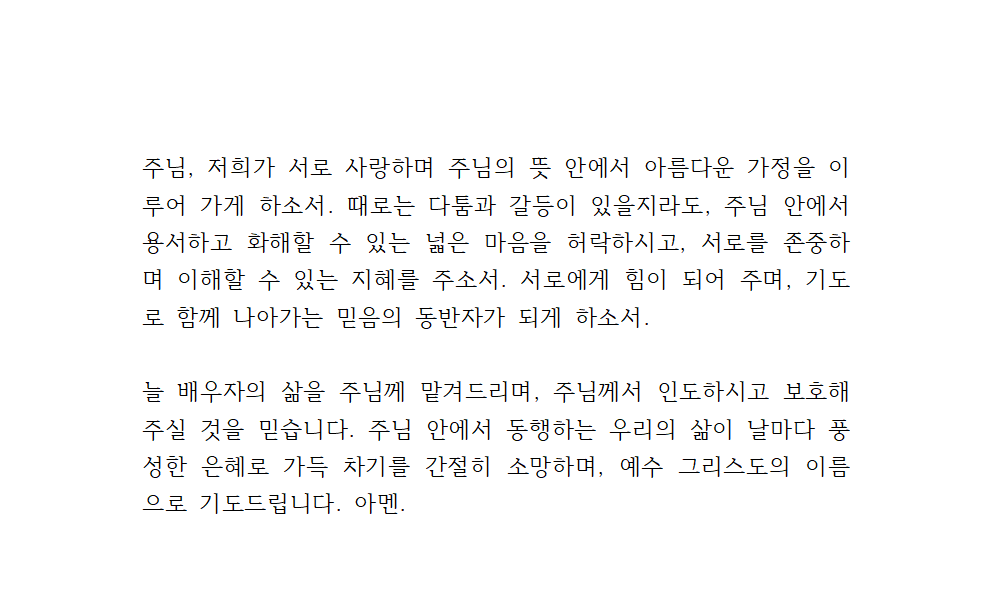 주님, 저희가 서로 사랑하며 주님의 뜻 안에서 아름다운 가정을 이루어 가게 하소서. 때로는 다툼과 갈등이 있을지라도, 주님 안에서 용서하고 화해할 수 있는 넓은 마음을 허락하시고, 서로를 존중하며 이해할 수 있는 지혜를 주소서. 서로에게 힘이 되어 주며, 기도로 함께 나아가는 믿음의 동반자가 되게 하소서.