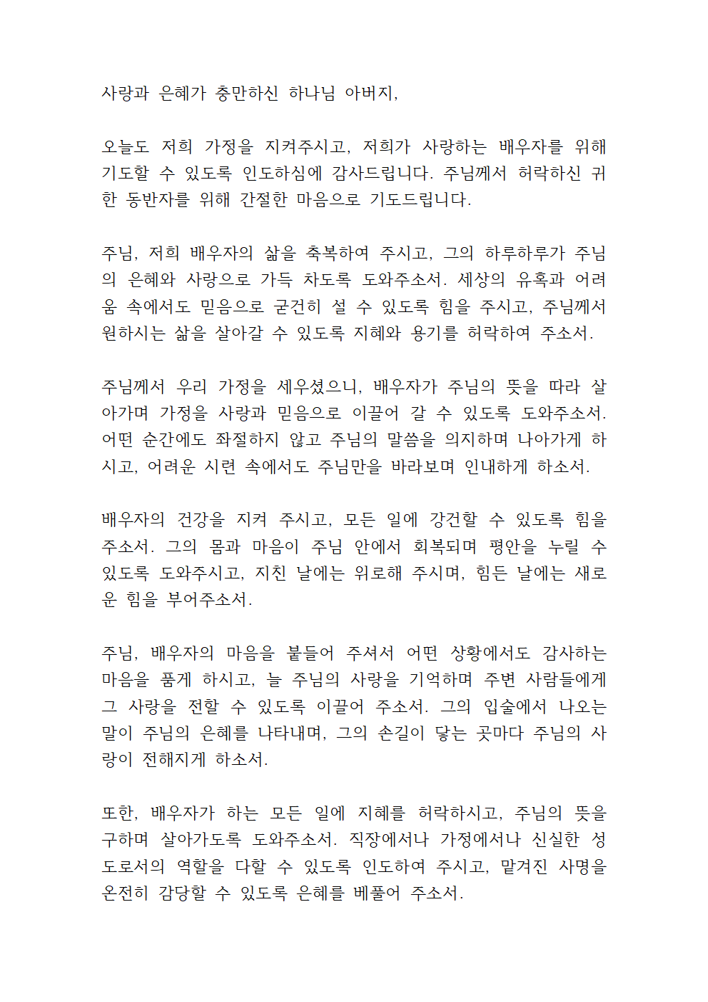 주님, 저희 배우자의 삶을 축복하여 주시고, 그의 하루하루가 주님의 은혜와 사랑으로 가득 차도록 도와주소서. 세상의 유혹과 어려움 속에서도 믿음으로 굳건히 설 수 있도록 힘을 주시고, 주님께서 원하시는 삶을 살아갈 수 있도록 지혜와 용기를 허락하여 주소서.