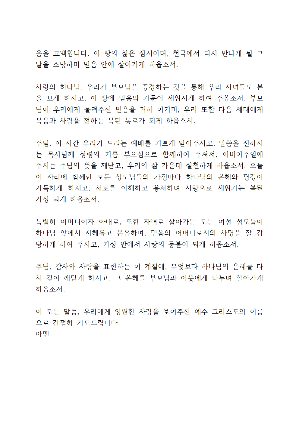 주님, 부모님의 헌신을 당연하게 여기지 않게 하시고, 그 사랑을 깊이 새기며 감사하는 자녀로 살아가게 하옵소서. 바쁜 일상 속에 부모님을 돌아보지 못했던 우리의 부족함을 용서하여 주시고, 남은 날 동안이라도 사랑을 표현하며 섬기게 하옵소서. 말 한마디, 작은 행동 하나라도 정성과 존경을 담아 부모님께 드릴 수 있는 자녀가 되게 하여 주옵소서.