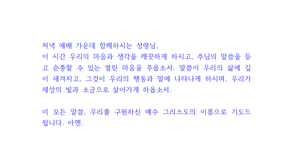이 시간 우리의 마음과 생각을 깨끗하게 하시고, 주님의 말씀을 듣고 순종할 수 있는 열린 마음을 주옵소서. 말씀이 우리의 삶에 깊이 새겨지고, 그것이 우리의 행동과 말에 나타나게 하시며, 우리가 세상의 빛과 소금으로 살아가게 하옵소서.