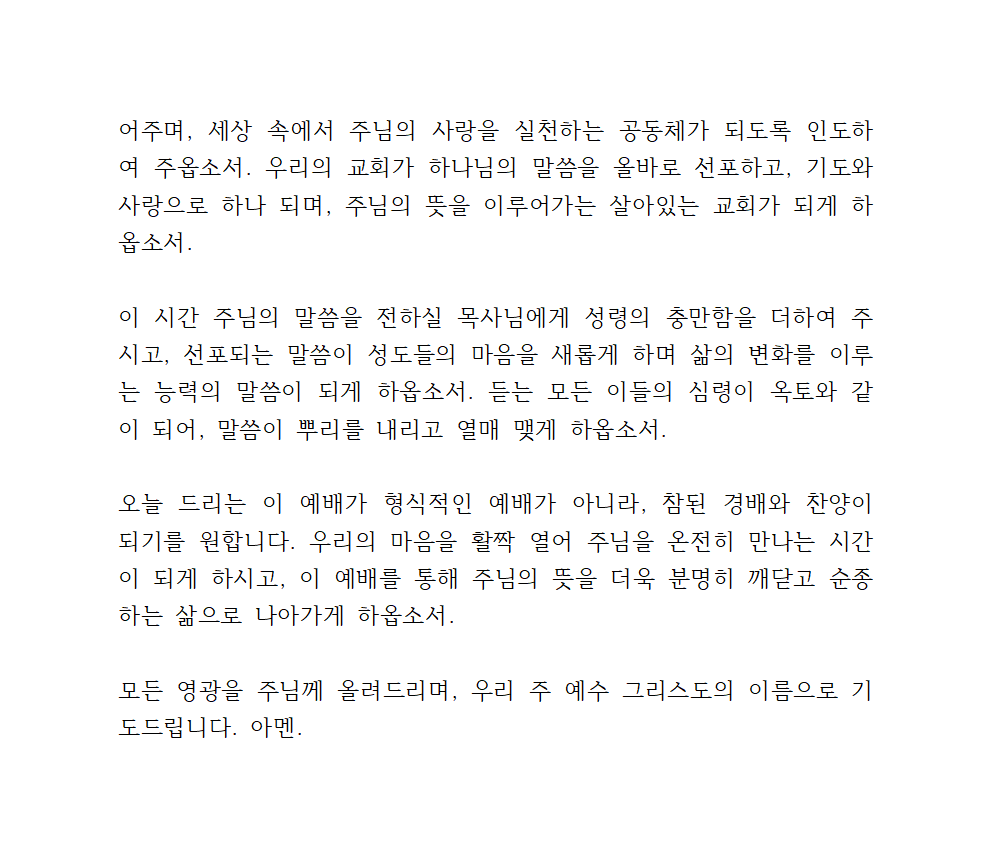 이 시간 주님의 말씀을 전하실 목사님에게 성령의 충만함을 더하여 주시고, 선포되는 말씀이 성도들의 마음을 새롭게 하며 삶의 변화를 이루는 능력의 말씀이 되게 하옵소서. 듣는 모든 이들의 심령이 옥토와 같이 되어, 말씀이 뿌리를 내리고 열매 맺게 하옵소서.