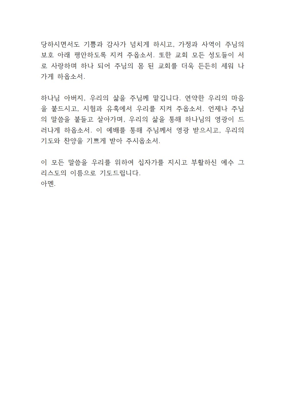 우리의 기도를 들으시고 응답하실 주님을 찬양하며, 우리를 위해 십자가에서 피 흘리신 예수 그리스도의 이름으로 기도드립니다.