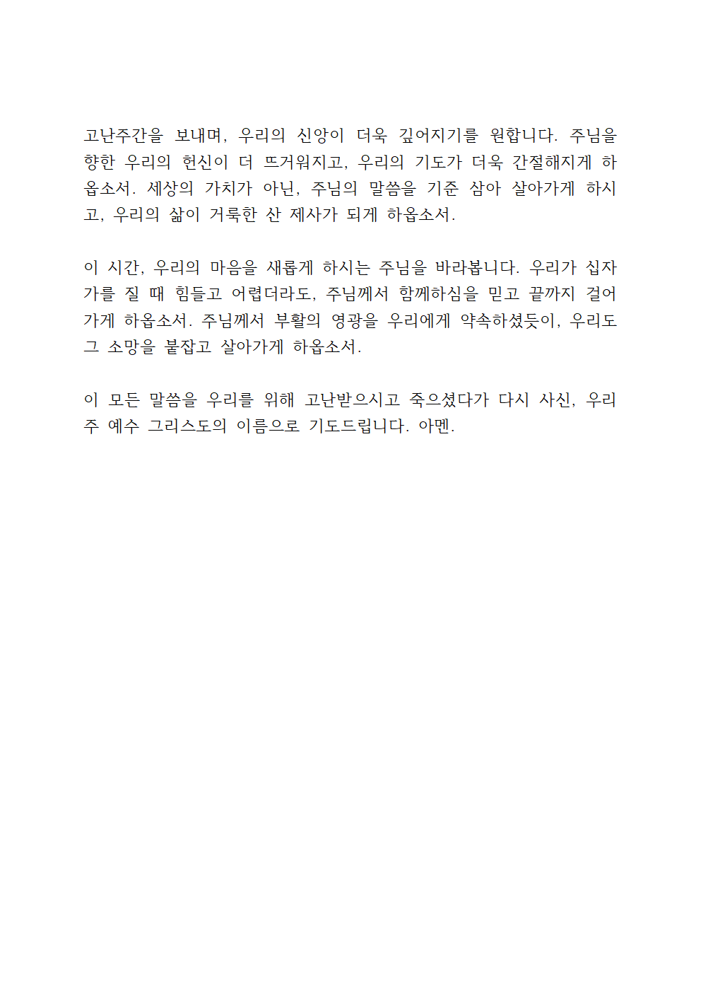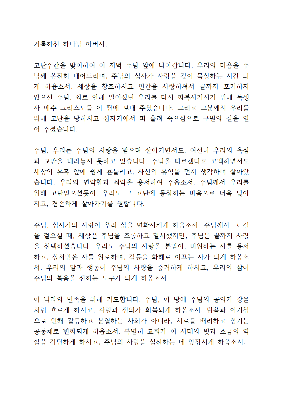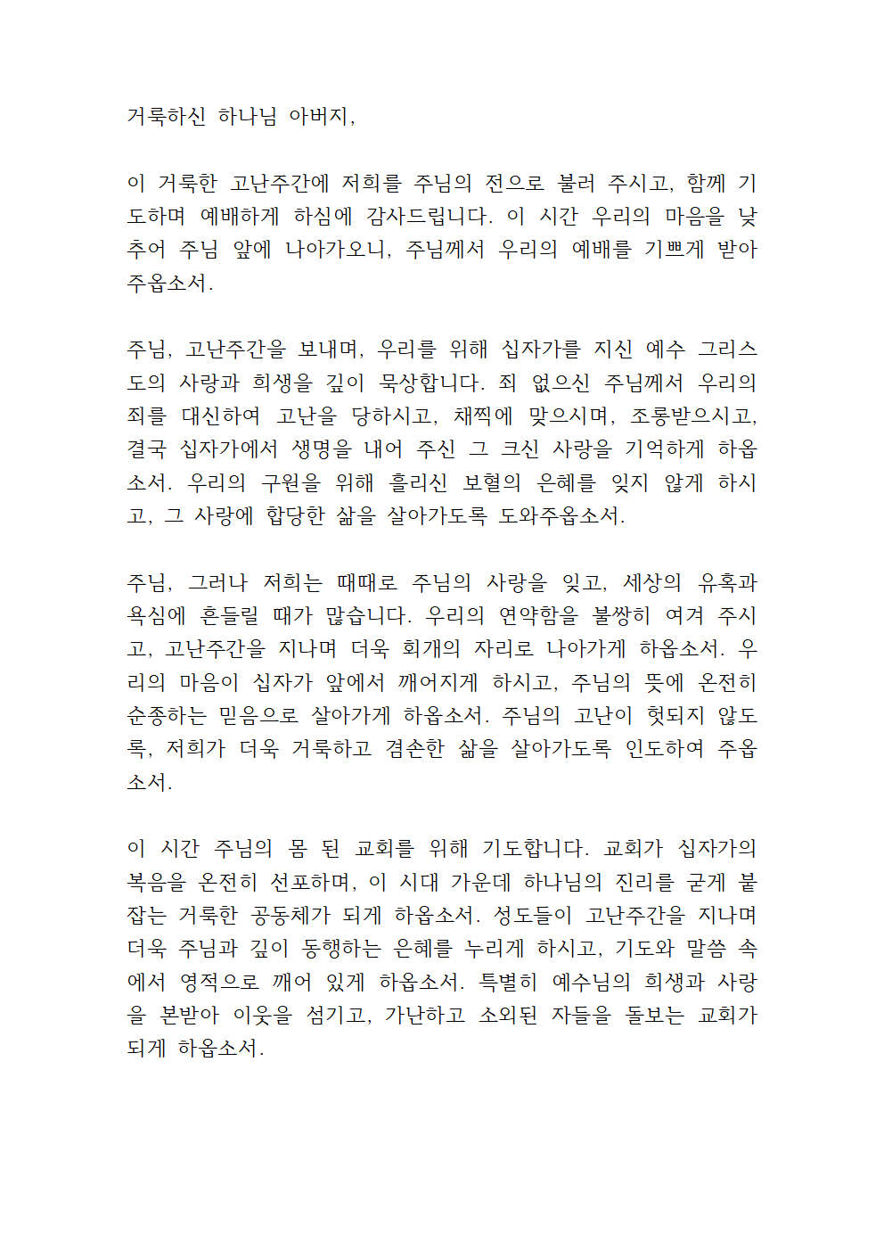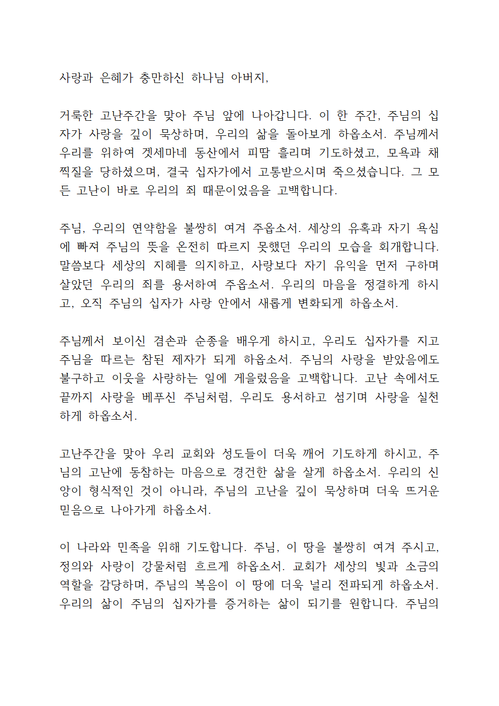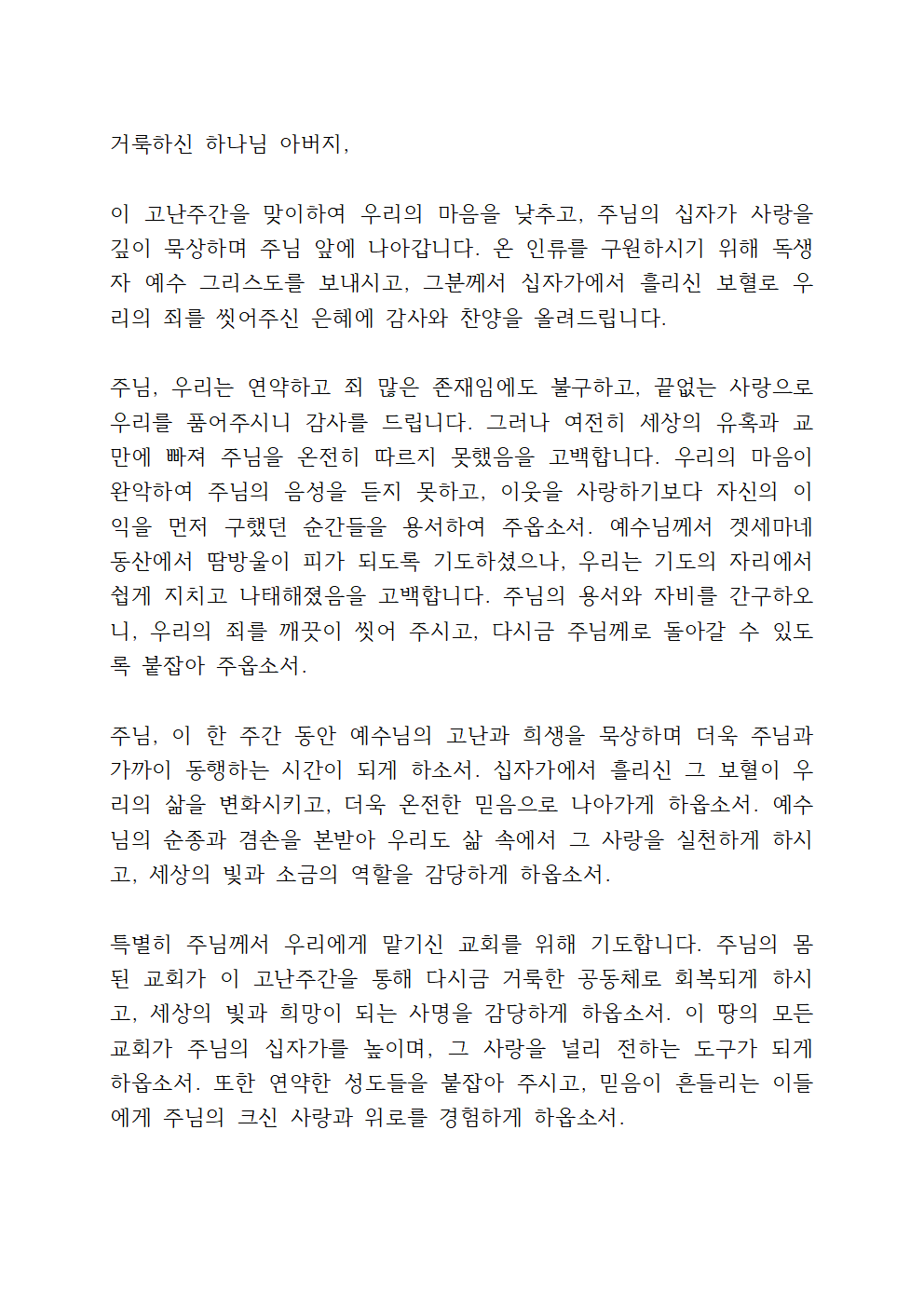 주님, 그러나 저희는 때때로 주님의 사랑을 잊고, 세상의 유혹과 욕심에 흔들릴 때가 많습니다. 우리의 연약함을 불쌍히 여겨 주시고, 고난주간을 지나며 더욱 회개의 자리로 나아가게 하옵소서. 우리의 마음이 십자가 앞에서 깨어지게 하시고, 주님의 뜻에 온전히 순종하는 믿음으로 살아가게 하옵소서. 주님의 고난이 헛되지 않도록, 저희가 더욱 거룩하고 겸손한 삶을 살아가도록 인도하여 주옵소서.