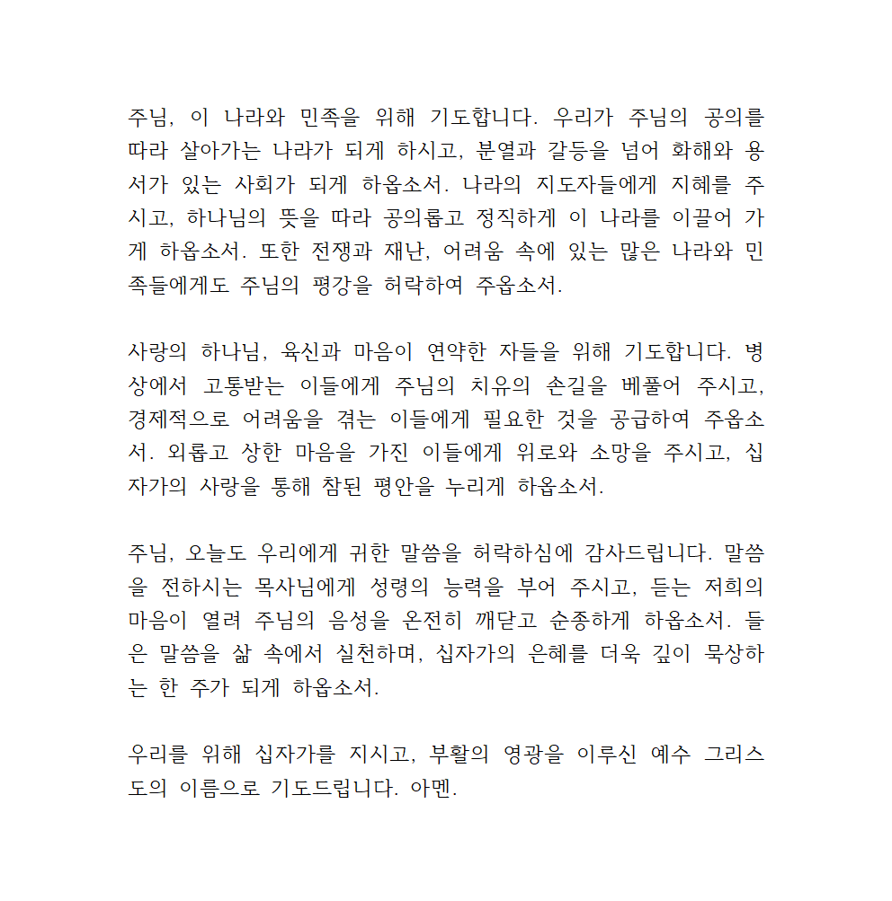 주님, 이 나라와 민족을 위해 기도합니다. 우리가 주님의 공의를 따라 살아가는 나라가 되게 하시고, 분열과 갈등을 넘어 화해와 용서가 있는 사회가 되게 하옵소서. 나라의 지도자들에게 지혜를 주시고, 하나님의 뜻을 따라 공의롭고 정직하게 이 나라를 이끌어 가게 하옵소서. 또한 전쟁과 재난, 어려움 속에 있는 많은 나라와 민족들에게도 주님의 평강을 허락하여 주옵소서.