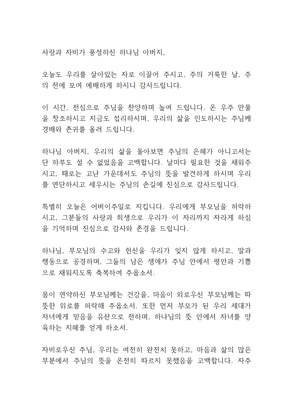 특별히 오늘은 어버이 주일로 지키며 예배드리오니, 우리 부모님들을 축복하여 주옵소서. 자녀들을 위해 기도하고 헌신하며 살아오신 그 삶 위에 하나님의 크신 위로와 은총이 임하게 하시고, 연로하신 부모님들의 건강과 평안을 지켜 주소서. 또한 우리에게 부모를 공경하라는 주님의 말씀을 늘 기억하게 하시고, 말과 행실로 공경과 사랑을 실천하는 자녀 되게 하소서.