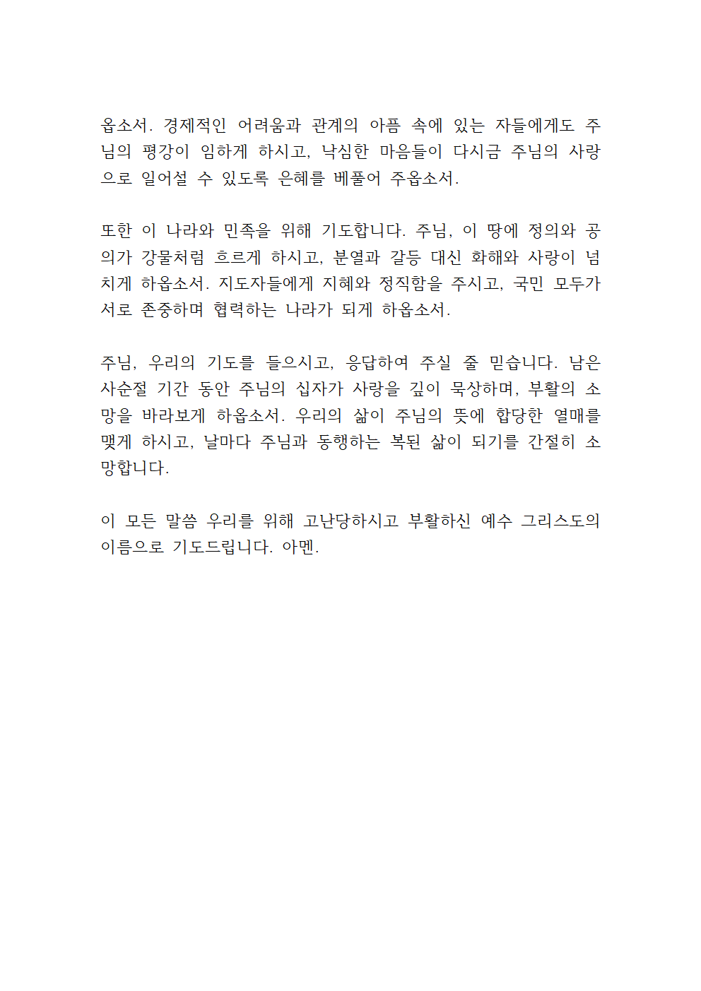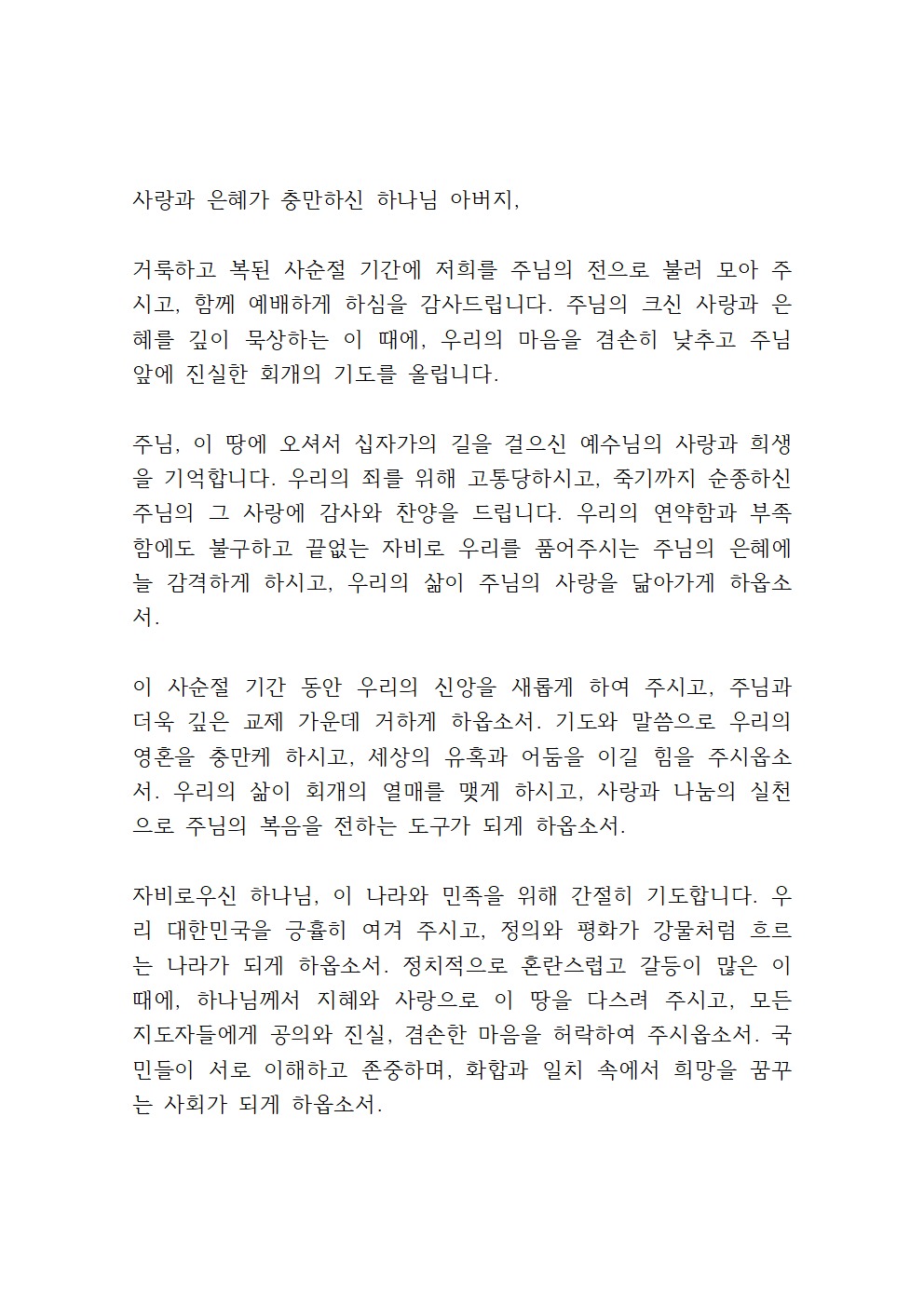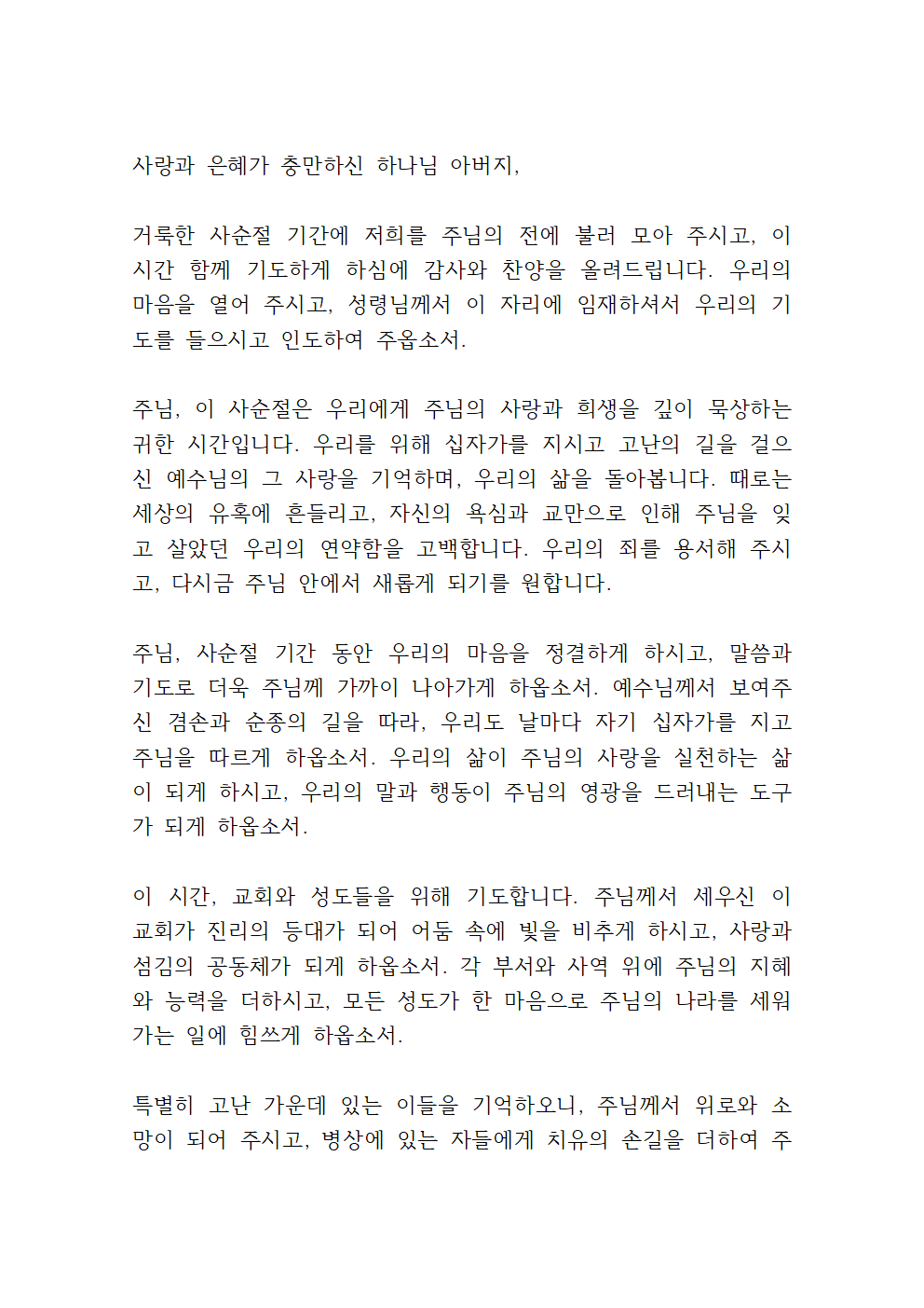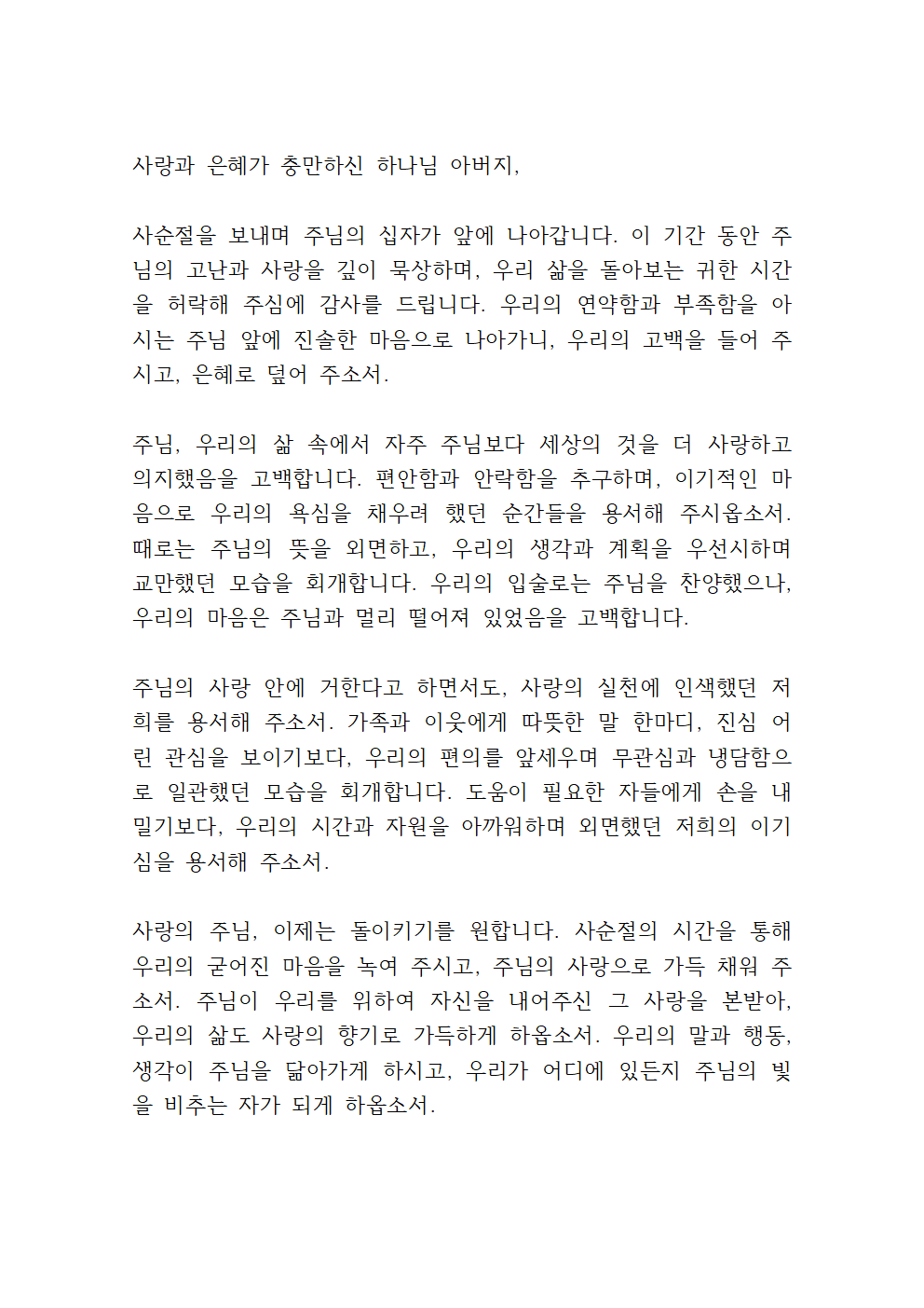 이 사순절 기간 동안 우리의 신앙을 새롭게 하여 주시고, 주님과 더욱 깊은 교제 가운데 거하게 하옵소서. 기도와 말씀으로 우리의 영혼을 충만케 하시고, 세상의 유혹과 어둠을 이길 힘을 주시옵소서. 우리의 삶이 회개의 열매를 맺게 하시고, 사랑과 나눔의 실천으로 주님의 복음을 전하는 도구가 되게 하옵소서.