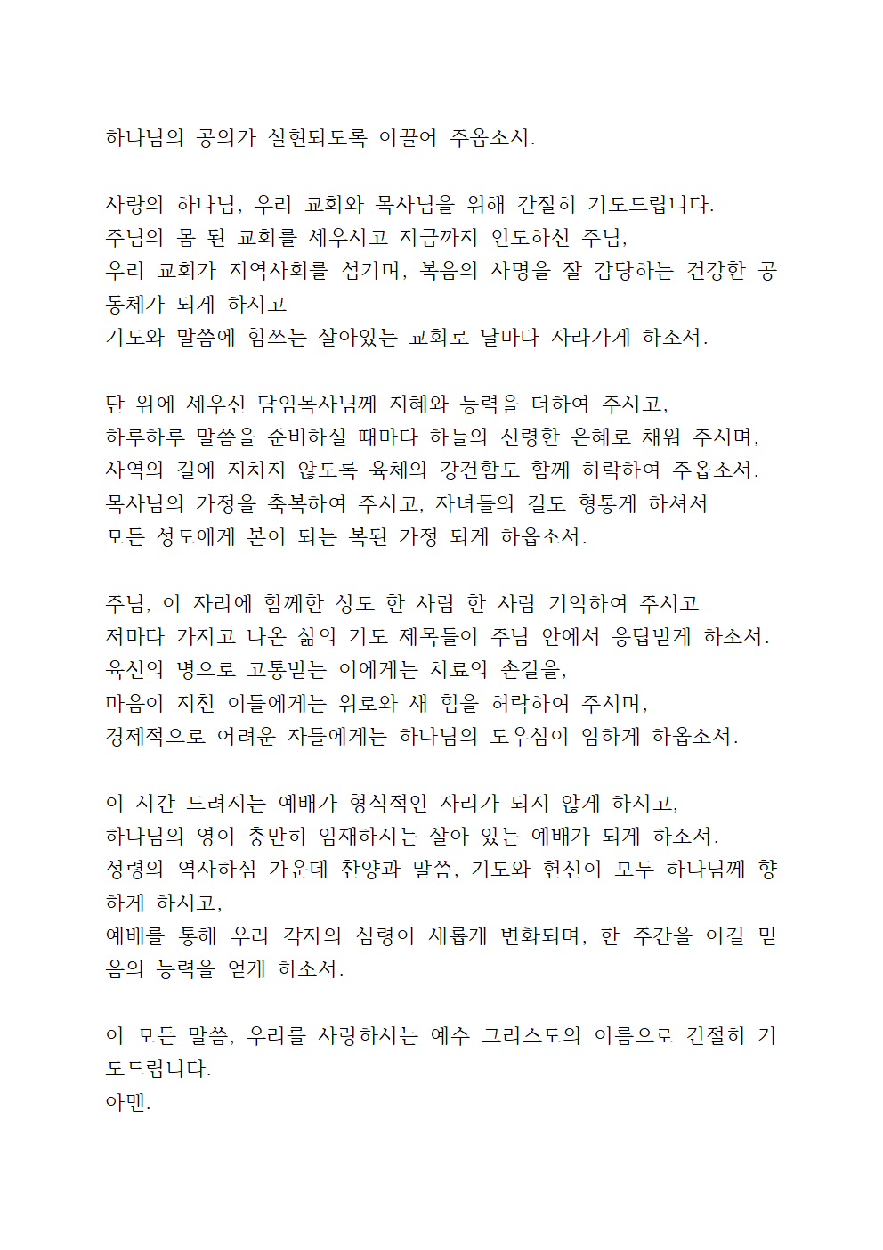 주님께서 세우신 담임목사님을 위해 간절히 기도드립니다. 목사님께 늘 성령의 충만함을 허락하시고, 말씀을 준비하실 때마다 주님의 깊은 지혜와 은혜로 채워주시며, 육신의 피곤함도 주님의 능력으로 감당케 하옵소서. 목사님의 가정도 평안하게 지켜주시고, 사역 가운데 기쁨과 열매가 충만하게 하옵소서.