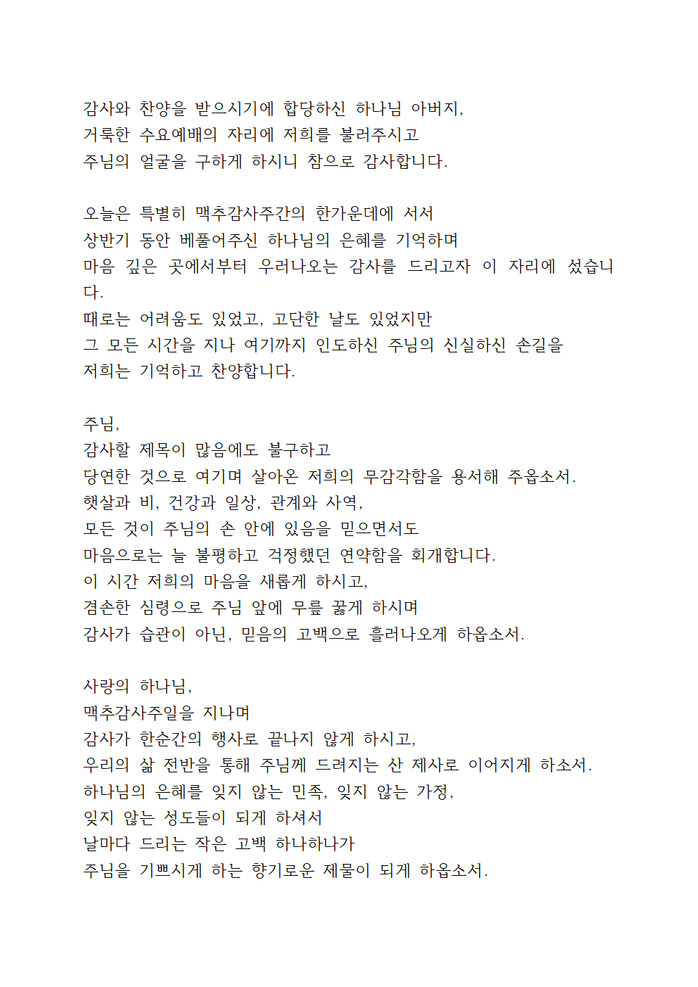 우리의 마음과 정성을 모아 드리는 이 예배가 주님께 향기로운 제사가 되기를 소망하며, 예수 그리스도의 이름으로 감사하며 기도드립니다.