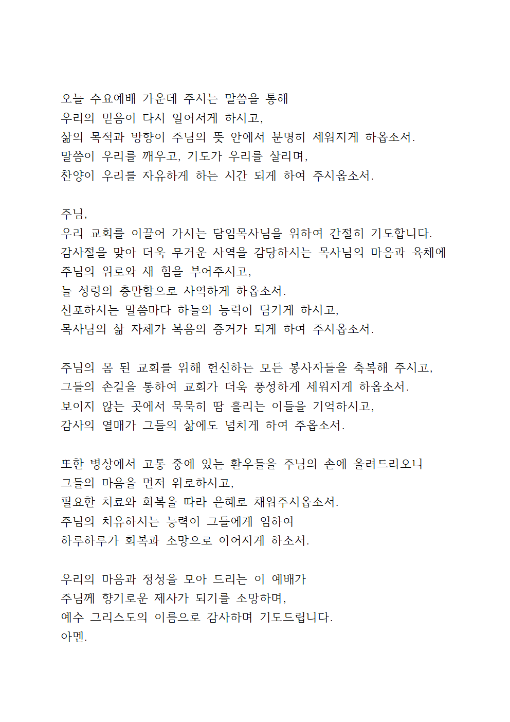 오늘 수요예배 가운데 주시는 말씀을 통해 우리의 믿음이 다시 일어서게 하시고, 삶의 목적과 방향이 주님의 뜻 안에서 분명히 세워지게 하옵소서. 말씀이 우리를 깨우고, 기도가 우리를 살리며, 찬양이 우리를 자유하게 하는 시간 되게 하여 주시옵소서.