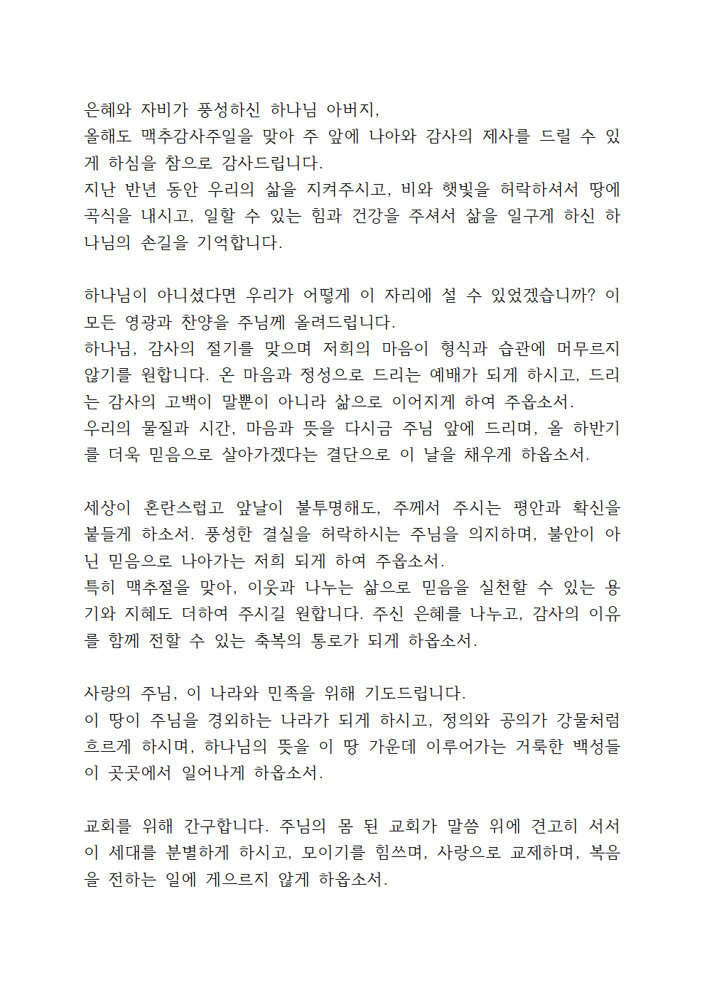 주님께서 허락하신 풍성한 수확의 기쁨을 누리며, 이 모든 것이 주님께로부터 온 것임을 고백하게 하소서. 물질의 풍요만을 구하는 것이 아니라, 영혼의 풍성함과 믿음의 열매를 먼저 바라보게 하시고, 더욱 주님을 가까이하며 순결한 믿음으로 나아가는 우리 모두 되게 하여 주옵소서. 세상 속에서 흔들리지 않는 신앙을 갖고, 주님의 사랑을 전하며 선한 영향력을 미치는 삶을 살도록 인도하여 주시옵소서.